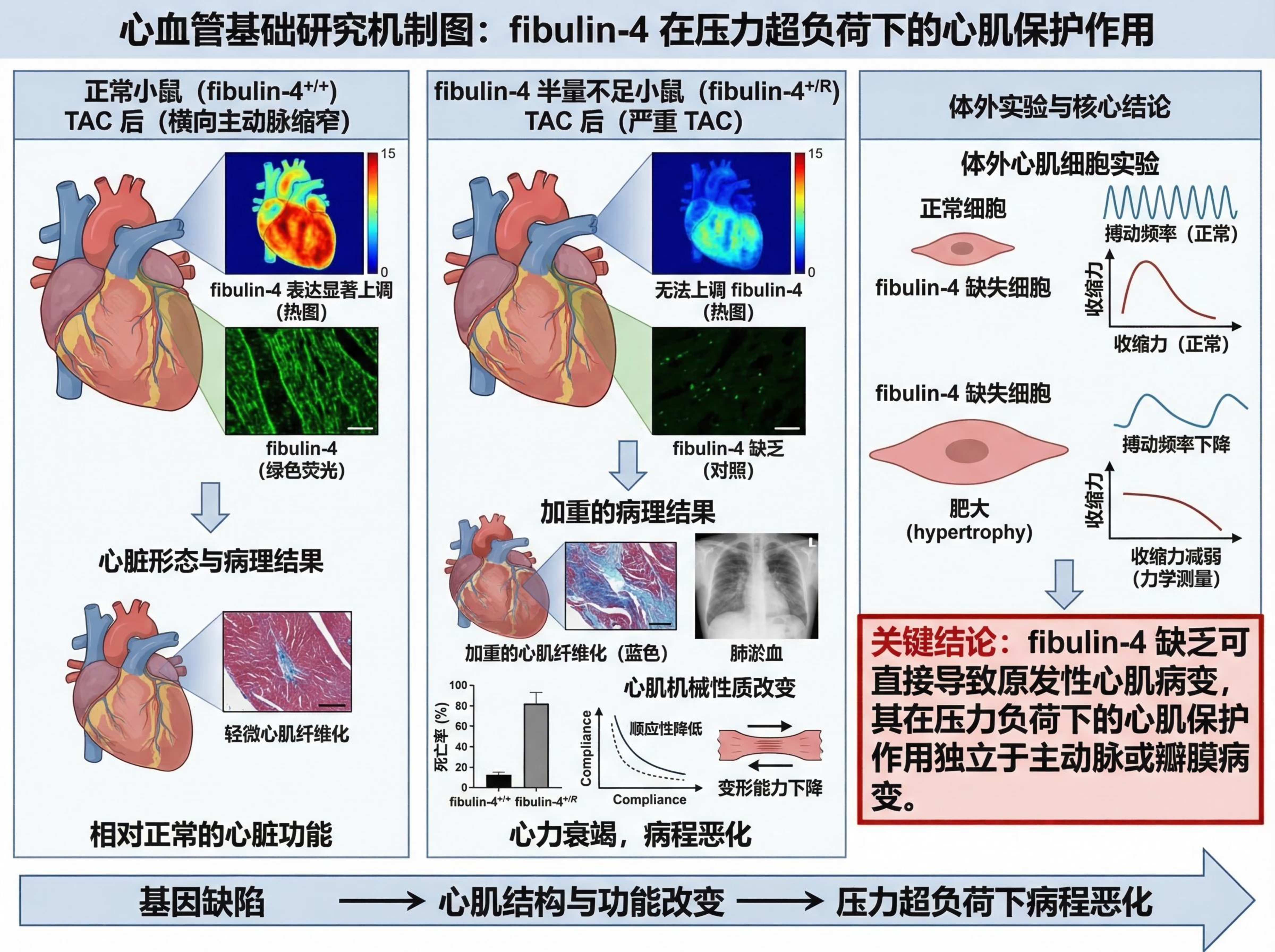 正常小鼠(fibulin-4+/+)在横向主动脉缩窄(TAC)后,整个心肌内 fibulin-4 表达显著上调 的示意图,并以热图或荧光染色方式显示。fibulin-4 半量不足小鼠(fibulin-4+/R)在同样严重 TAC 下 无法上调 fibulin-4 的对照示意。分别展示两种小鼠在 TAC 后的心脏形态与病理结果:fibulin-4+/R 小鼠出现 加重的心肌纤维化、肺淤血、更高的死亡率。心肌机械性质改变,如顺应性降低或变形能力下降。体外实验示意图:fibulin-4 缺失导致心肌细胞 肥大(hypertrophy),搏动频率下降,收缩力减弱(通过牵张实验、力学测量或细胞动力学图示体现)。图中强调关键结论:“fibulin-4 缺乏可直接导致原发性心肌病变,其在压力负荷下的心肌保护作用独立于主动脉或瓣膜病变。”整体设计为分区的机制图或实验结果整合图,清晰呈现:基因缺陷 → 心肌结构与功能改变 → 压力超负荷下病程恶化。