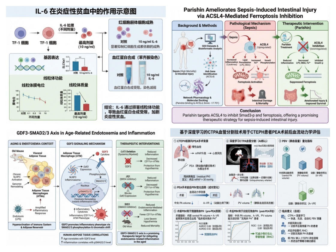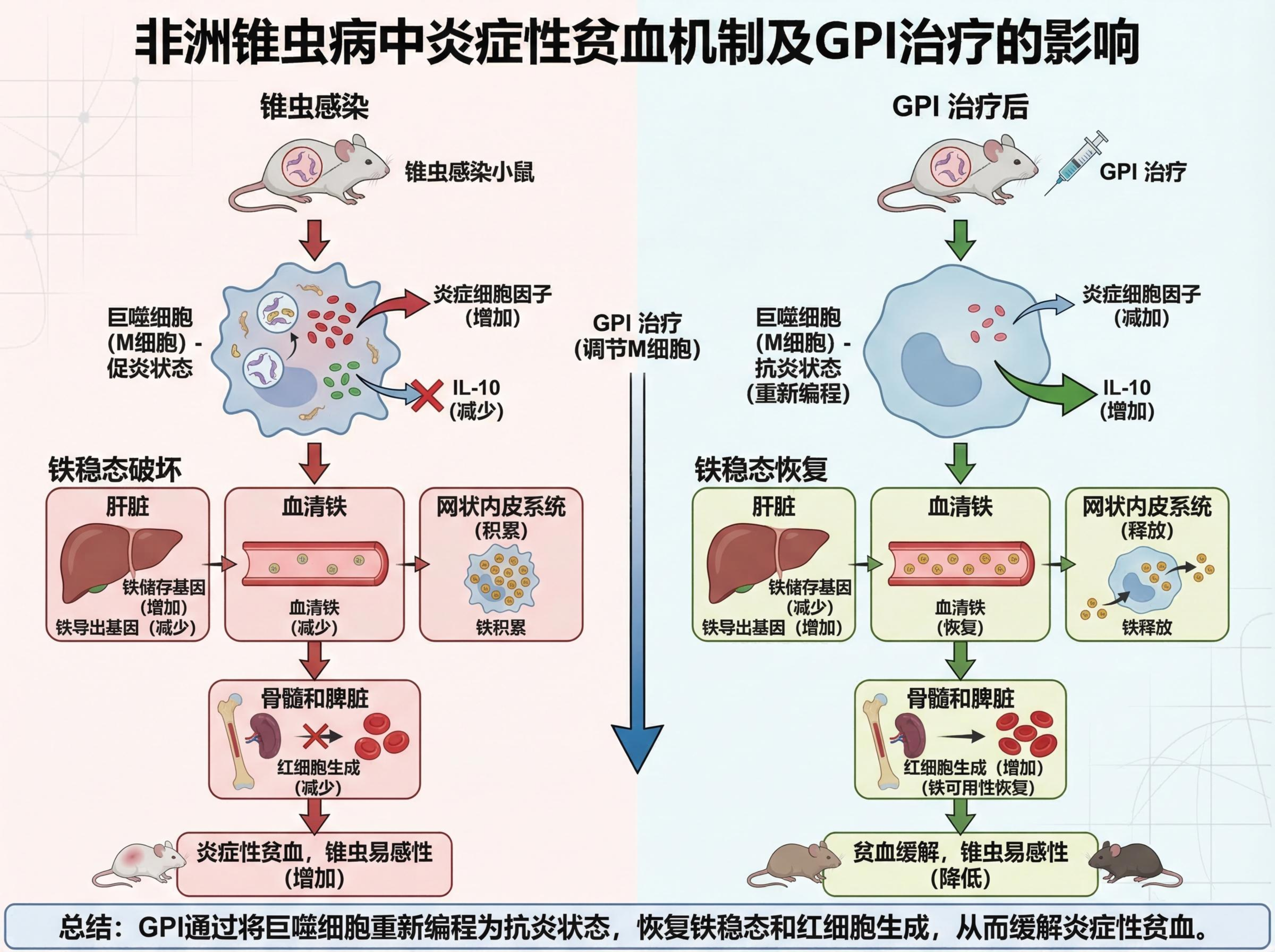 提示词: 非洲锥虫病中的炎症性贫血机制以及GPI治疗的影响:图中应展示锥虫感染小鼠中,铁的稳态被破坏,导致铁在网状内皮系统的积累。重点展示巨噬细胞(M细胞)在此贫血类型的诱导与维持中的作用,并展示GPI治疗如何通过调节M细胞,减轻贫血和锥虫易感性。图中应突显以下关键过程: (i) GPI治疗后,减少炎症细胞因子的产生,并增加IL-10的分泌,这与贫血的缓解和血清铁水平的恢复相关;(ii) 肝脏中铁储存基因向铁导出基因的转变;(iii) 骨髓和脾脏中红细胞生成的增加,可能反映了铁稳态的恢复及铁的可用性。图示应强调通过将巨噬细胞重新编程为抗炎状态,可以通过恢复铁稳态和红细胞生成来缓解炎症性贫血。