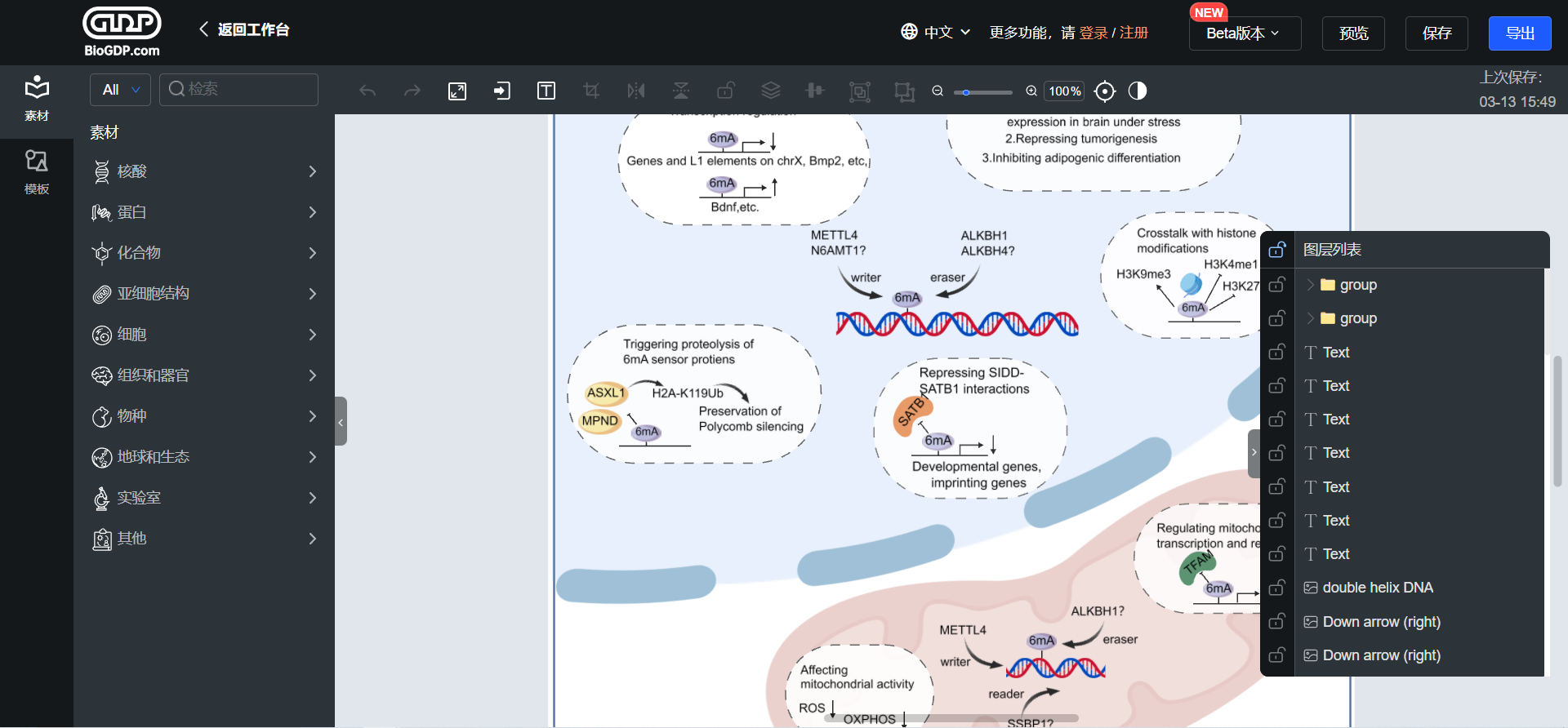操作特别简单易懂,你只要把想画的内容直接写进文档,点一下自由生图或机制图,马上就能做出顶刊水平的机制通路图、实验流程图。生成的图片还支持分层编辑,文字内容、字体、大小都能一键修改,完全贴合论文配图需求。