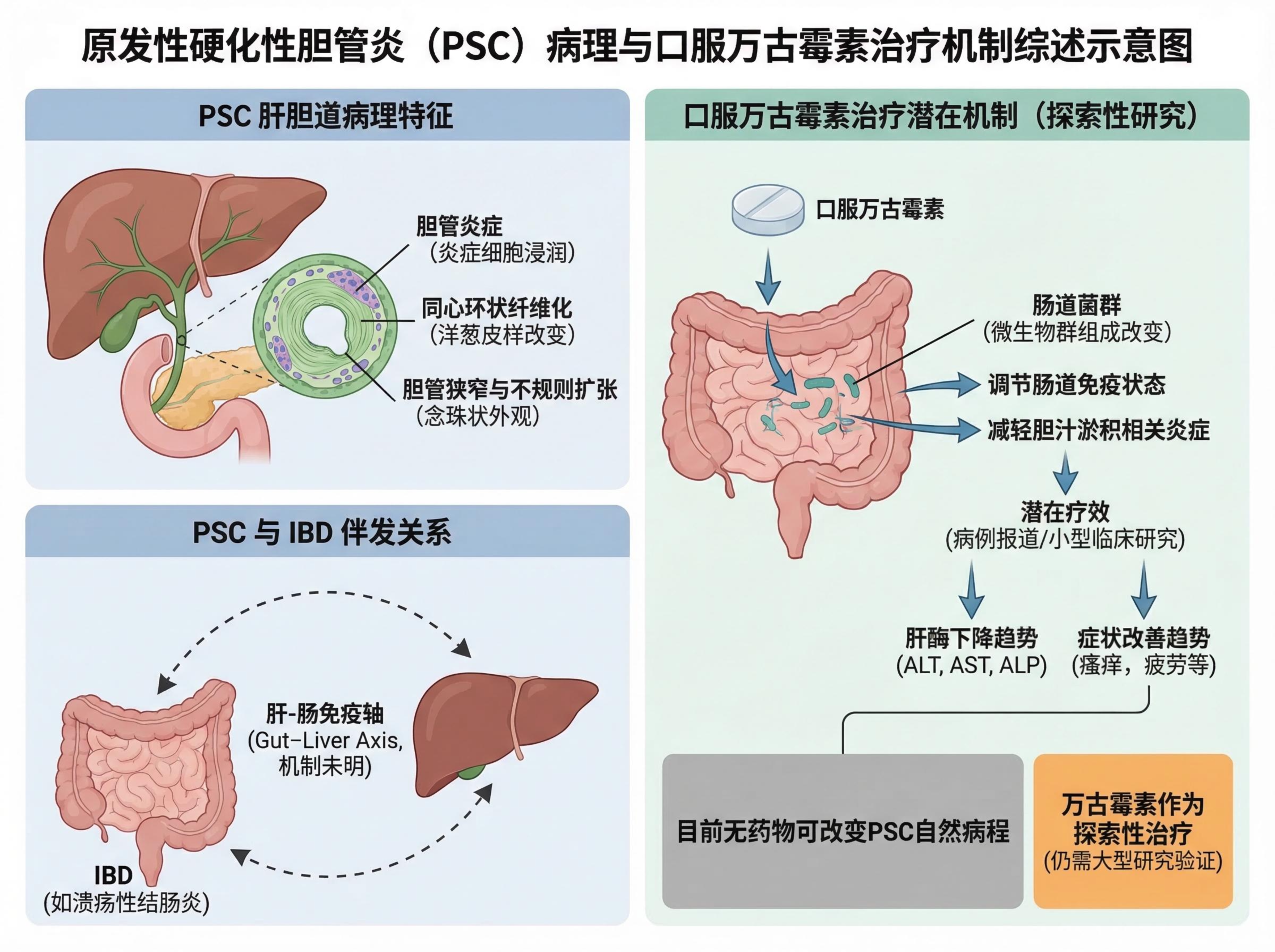 提示词:医学综述示意图,展示原发性硬化性胆管炎(PSC)的病理特征与口服万古霉素治疗的潜在机制。图中包括:PSC 的肝胆道病理示意:胆管炎症、同心环状纤维化、胆管狭窄的结构变化。PSC 与炎症性肠病(IBD)伴发关系的示意图,例如肝胆系统与肠道免疫轴(gut–liver axis)的连接,突出机制未明。口服万古霉素治疗路径示意:药物经肠道作用于肠道菌群 → 改变微生物群组成 → 调节肠道免疫状态与胆汁淤积相关炎症。展示万古霉素在病例报道与小型临床研究中对 PSC+IBD 的潜在疗效,如肝酶下降、症状改善等(用趋势箭头表示,不夸大疗效)。对比“目前无药物可改变PSC自然病程”与“万古霉素作为探索性治疗”的定位。图像整体为医学论文综述配图风格,清晰呈现病理、生理与治疗研究方向的逻辑关系。